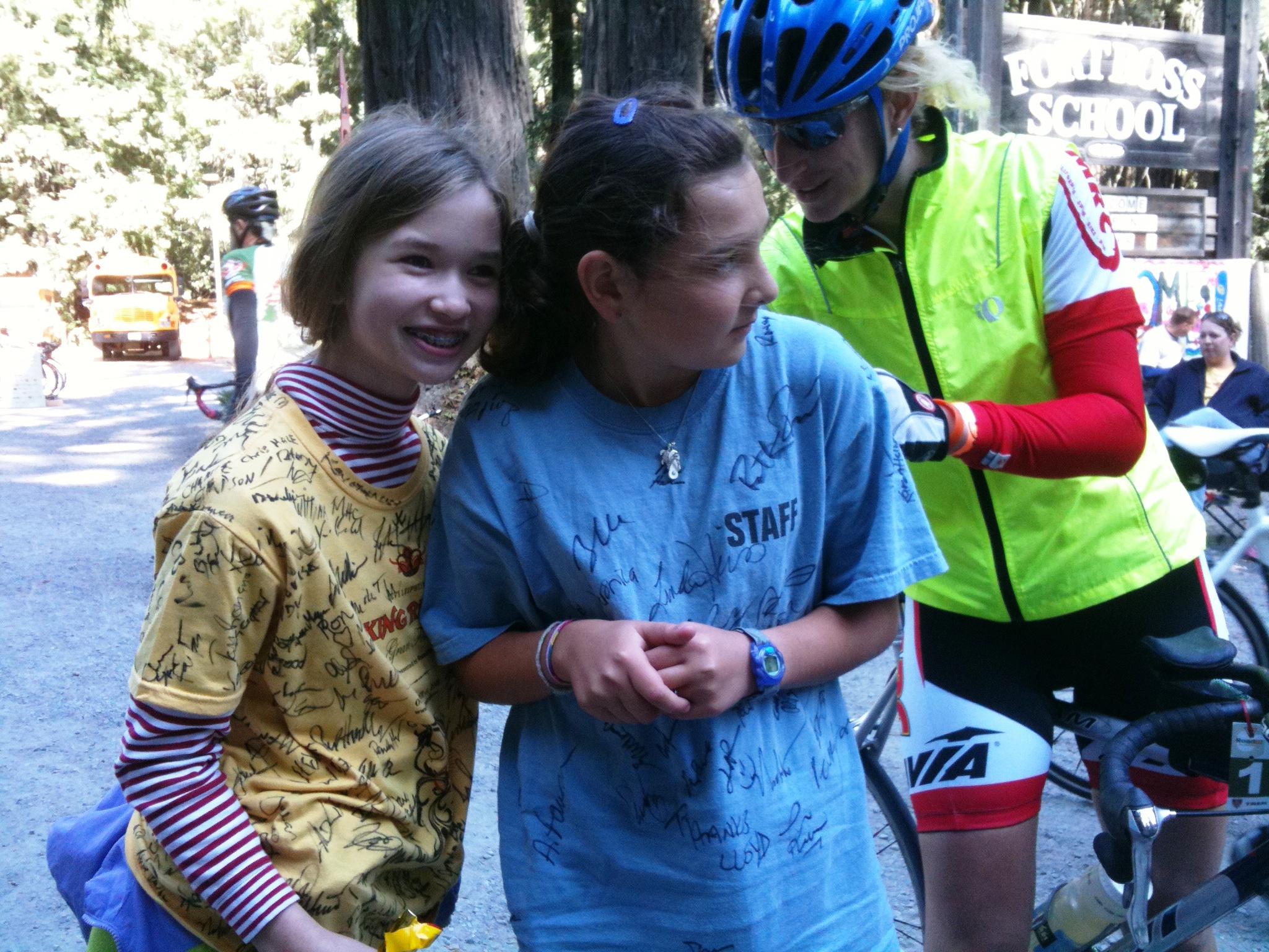 Before the Fondo I had endless fantasies of the ride – fantasies that involved the man himself coaching me up the steepist grades and getting me there. Hey, if you’re going to dream, dream BIG! The hilarity of that fantasy came into sharp focus when we got to the aid station in Ft. Ross We spoke to some adorable girls who had everyone who passed through sign their volunteer shirts.