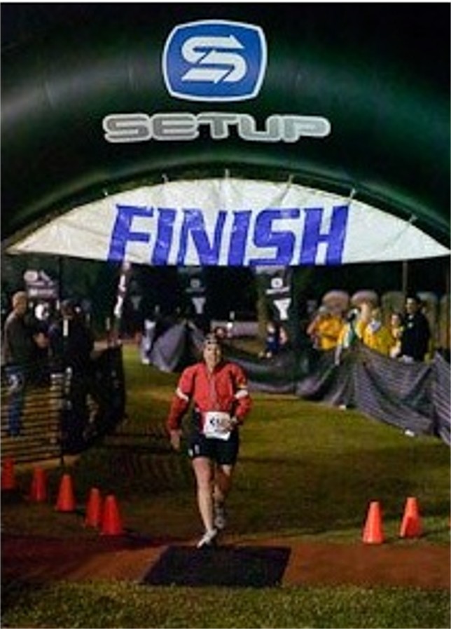 Someone turned on the fans and as the hot air blew through there I turned to Erin and said, “I think they’re trying to cook us” so we decided to go. They had already put my stuff in the car but I needed my head lamp and gloves which I had ditched just before the finish line so the picture would come out better and I sent poor Erin off to fetch them. Meanwhile Marcus and I started to head over to the water taxi stopping only to look at the results. It showed that one other woman in my age group had finished but it hadn’t been updated for a while so I didn’t pay too much attention. I was in no shape to pay attention, anyhow.