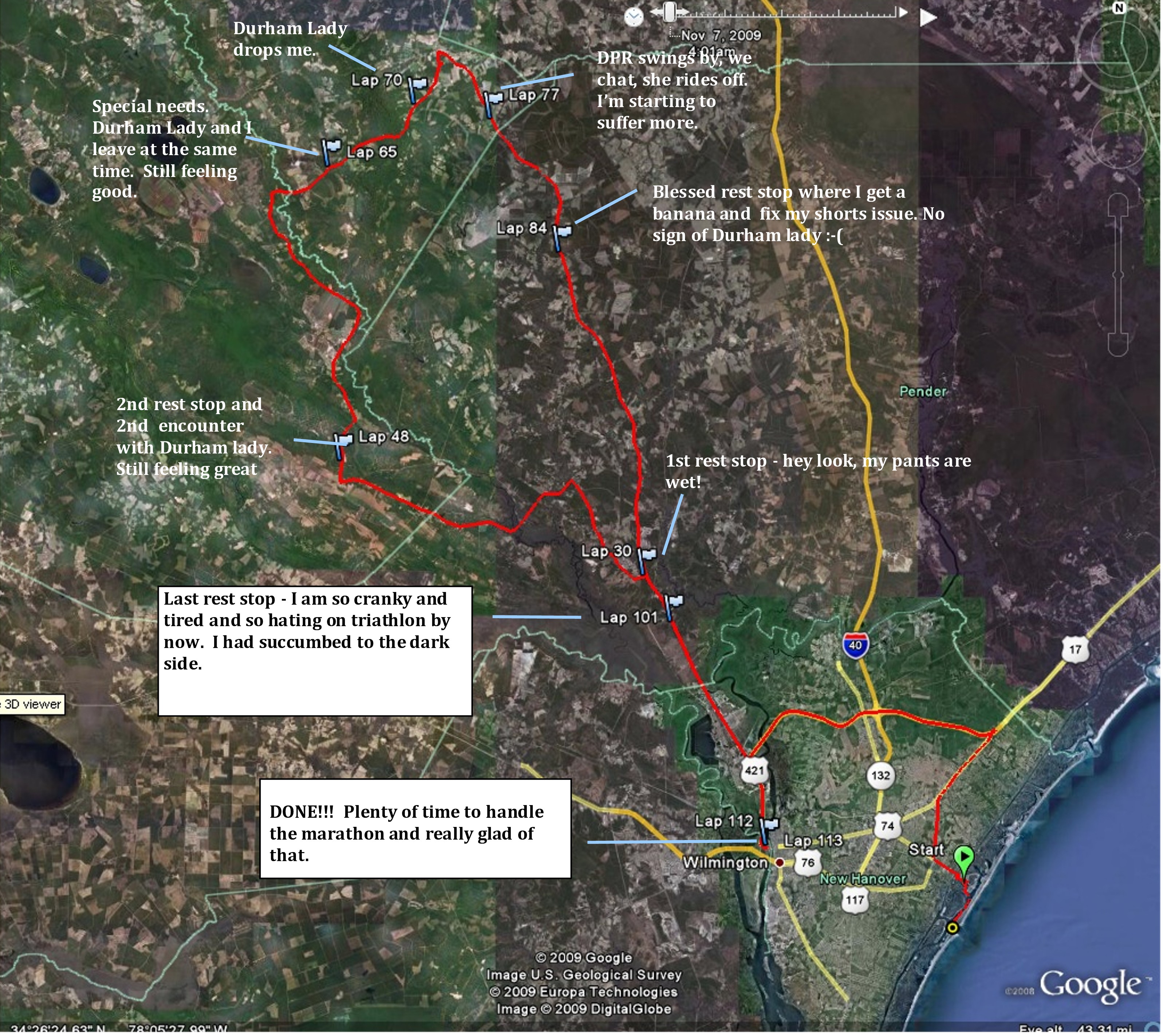 At about mile 70 Durham lady picked it up a bit and I started to lose it. I was getting really tired and I had forgotten to put on more Aquaphore at special needs and my lady bidness was starting to suffer. As we rounded the bend at about mile 75 we started going straight into the wind and it had picked up a bit by now.