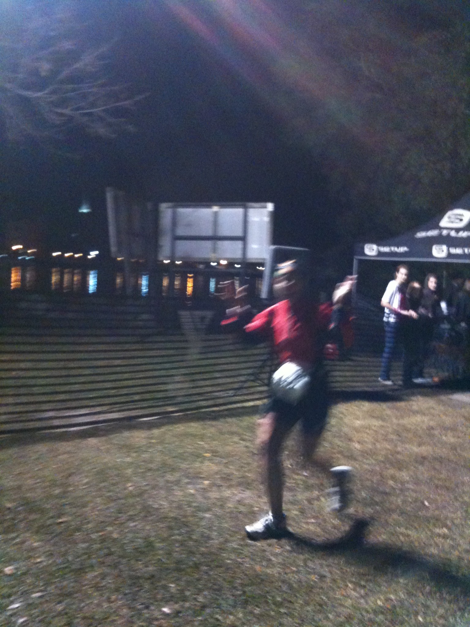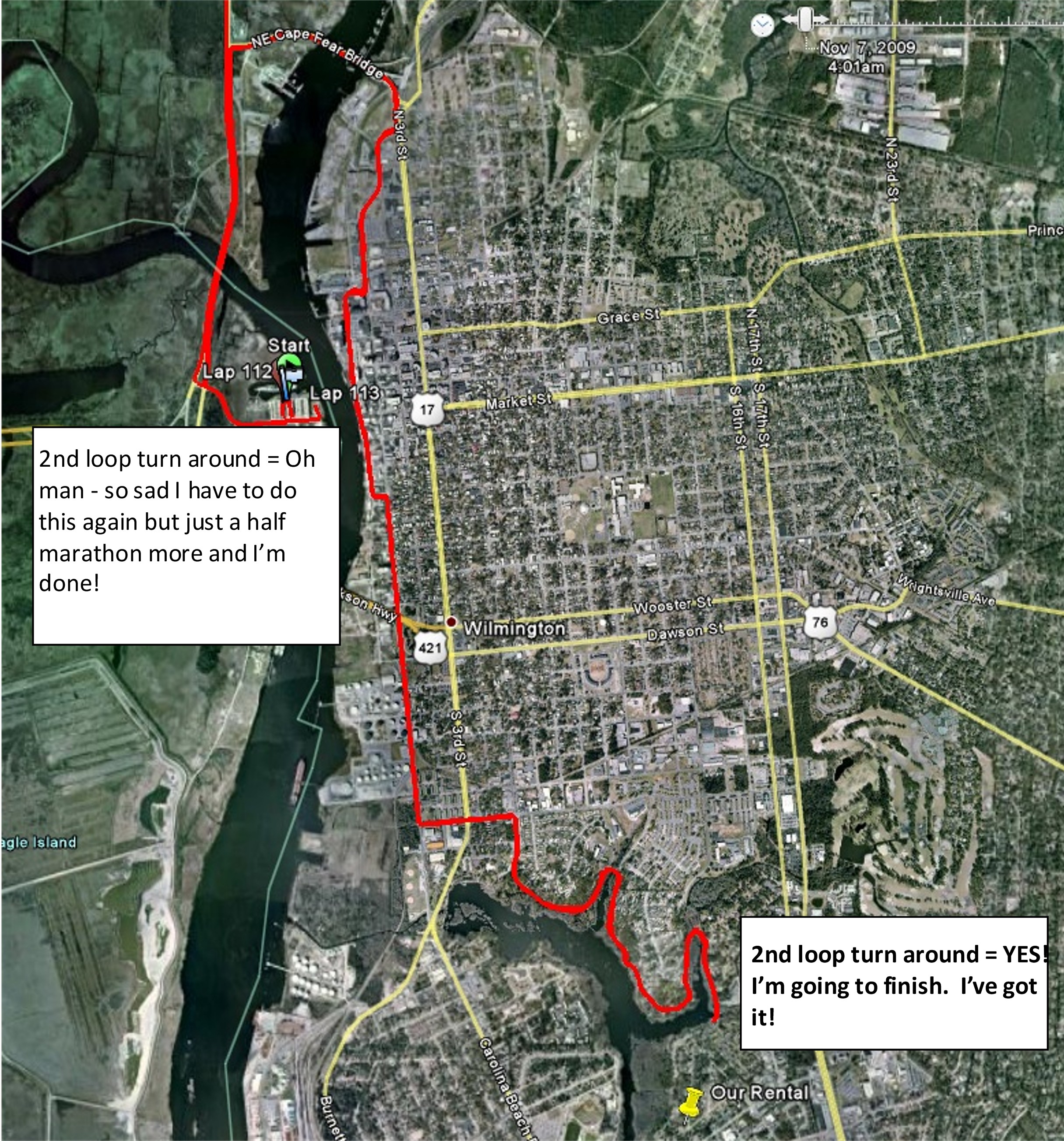 This is the part of an Ironman where what you see on the course is sheer carnage. People who are sick, people who blew up on the bike, people who are limping. It’s kind of a parade of misery but it was almost over so on I went. As I approached the turn around for the 2nd time it seemed like it had moved. I even asked some guy where they were hiding it and why did they move it like that and that was good for a laugh.