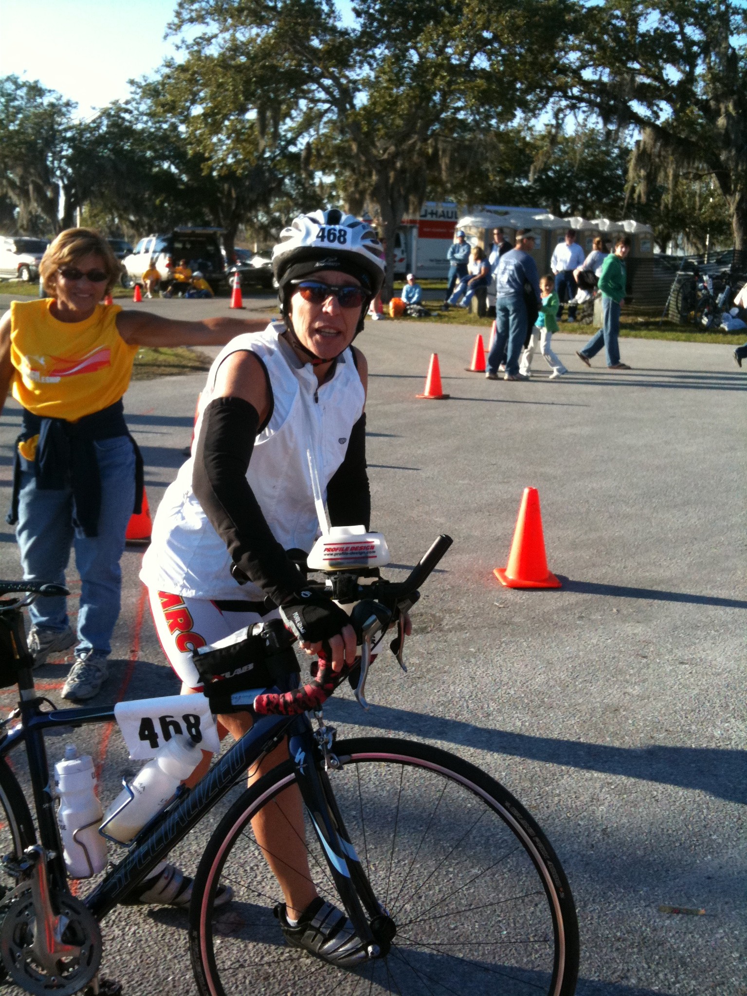 I had originally intended to swim with my arm warmers under my wetsuit and just pull on a jacket, my helmet, socks, shoes and sunglasses and go! It was quite a bit colder than I had anticipated, though so I decided to switch to “‘put on dry arm warmers, etc. and go!” but then, in the 11th hour (i.e. in the changing tent) I decided to also change my shorts. This was a mistake because it took time. T1 ended up taking 8 minutes and I could have stuck with Plan A and been out of there in 4.